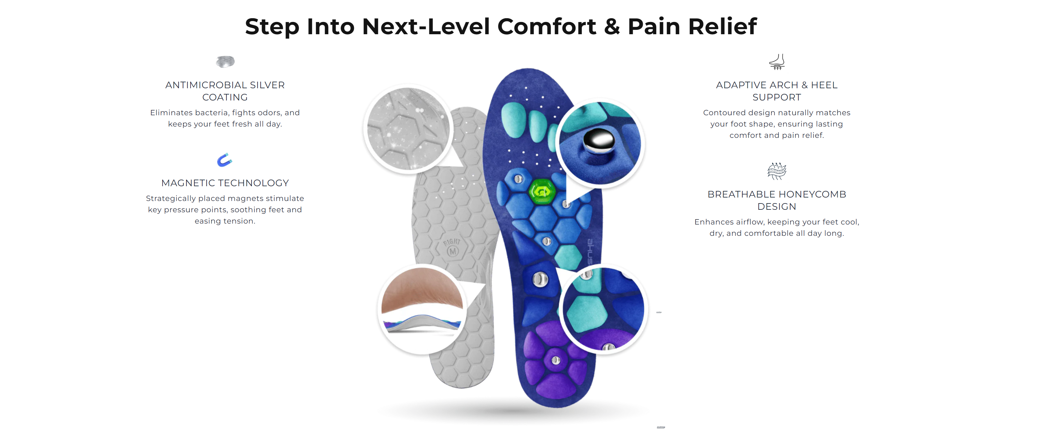 SoleVive™ insoles use targeted acupressure magnets to stimulate pressure points in your feet, improving circulation, reducing pain, and boosting energy throughout the day.